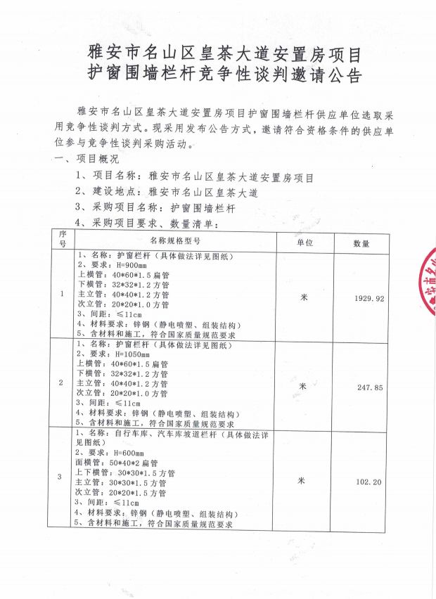 雅安市名山區(qū)皇茶大道安置房項(xiàng)目 護(hù)窗圍墻欄桿競爭性談判邀請公告